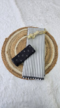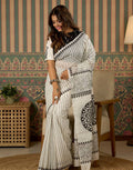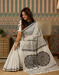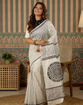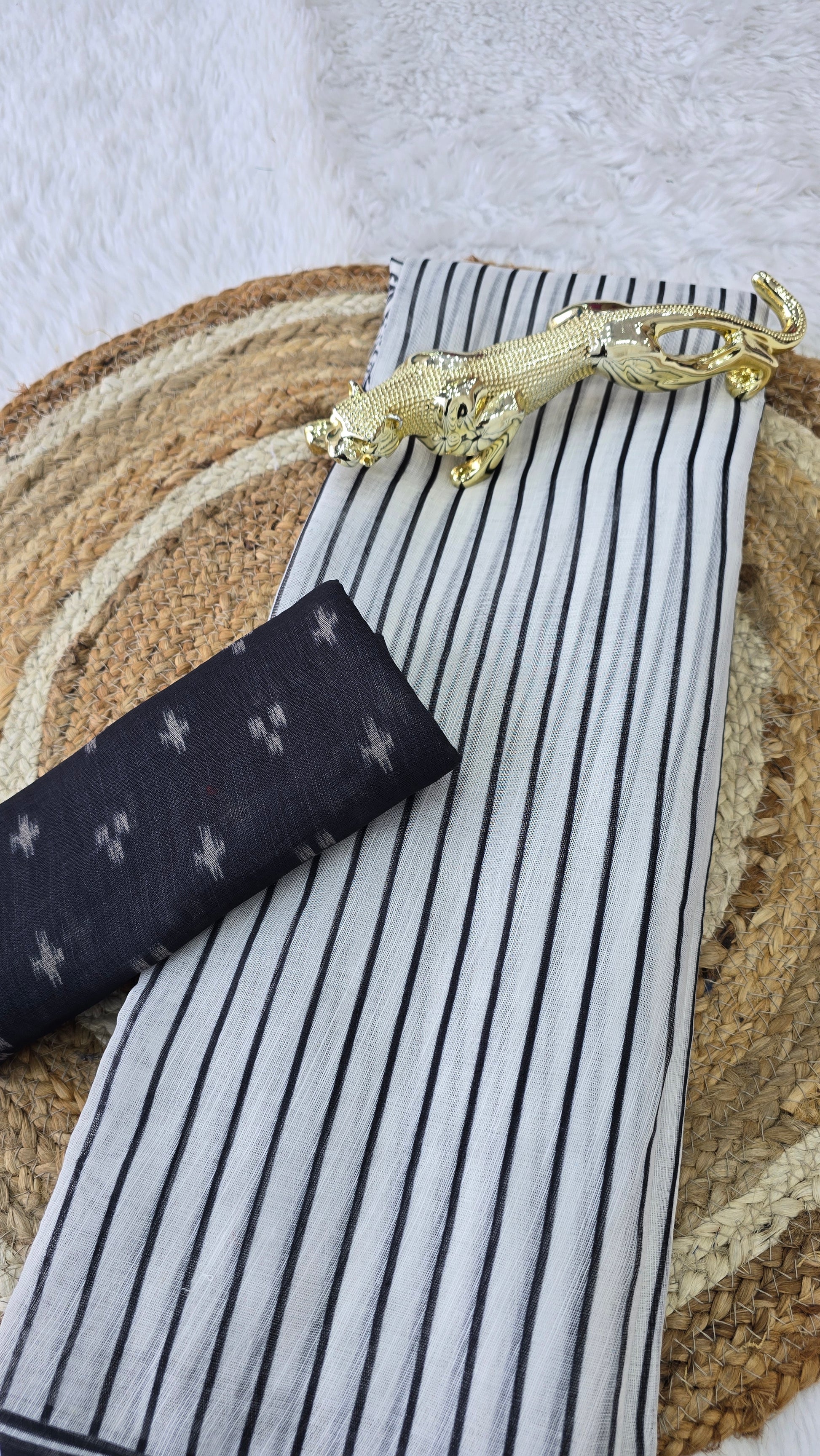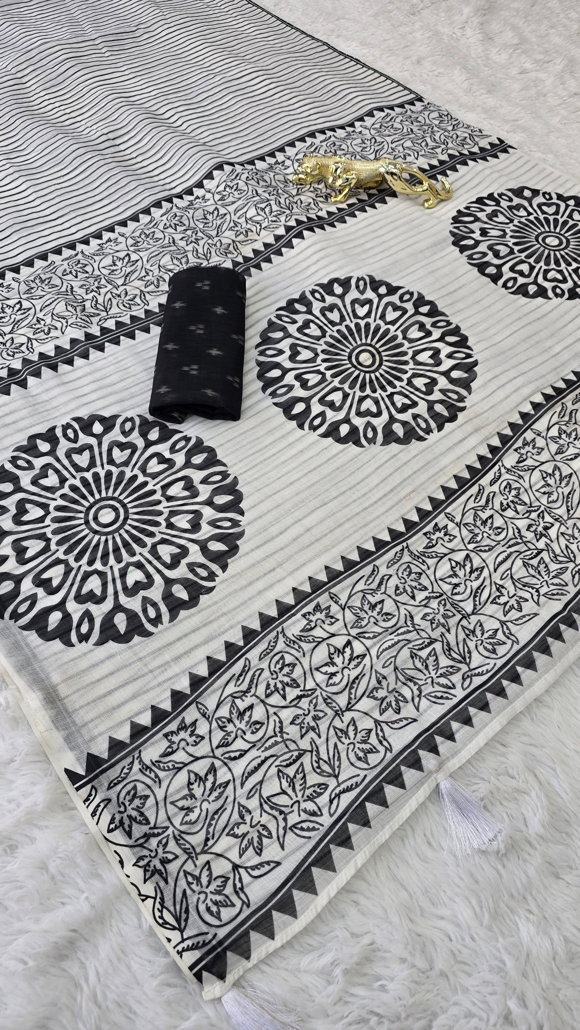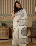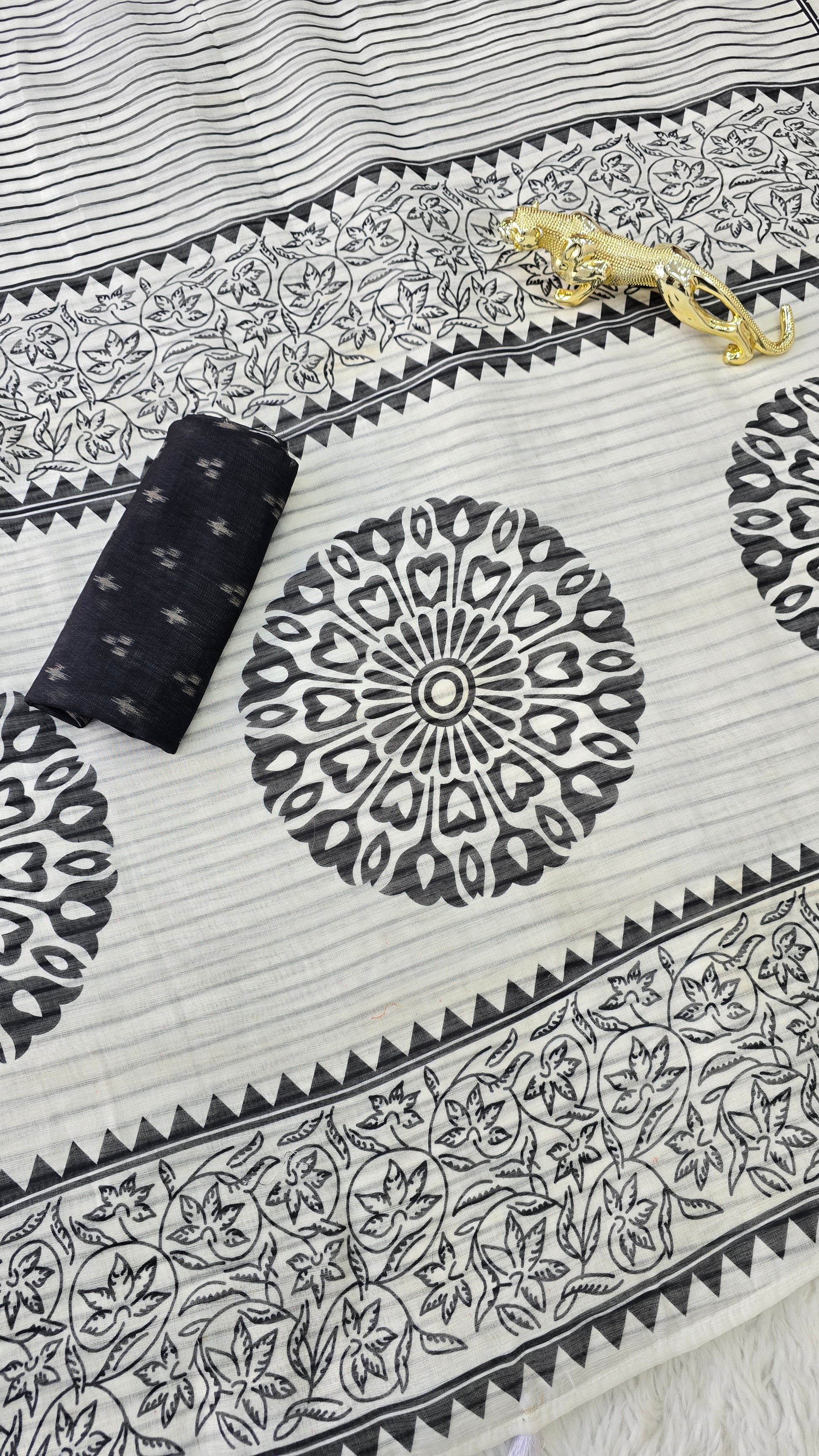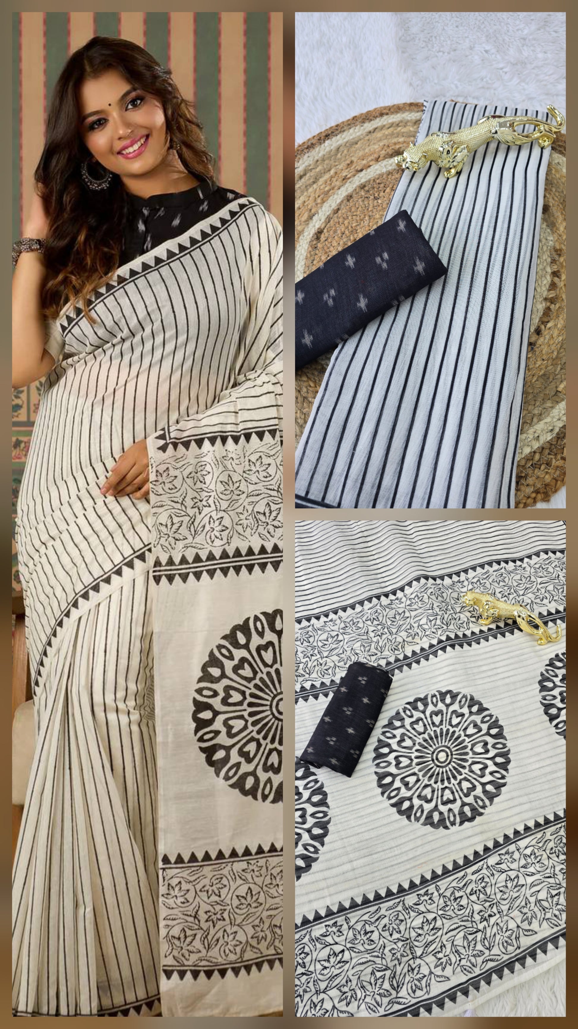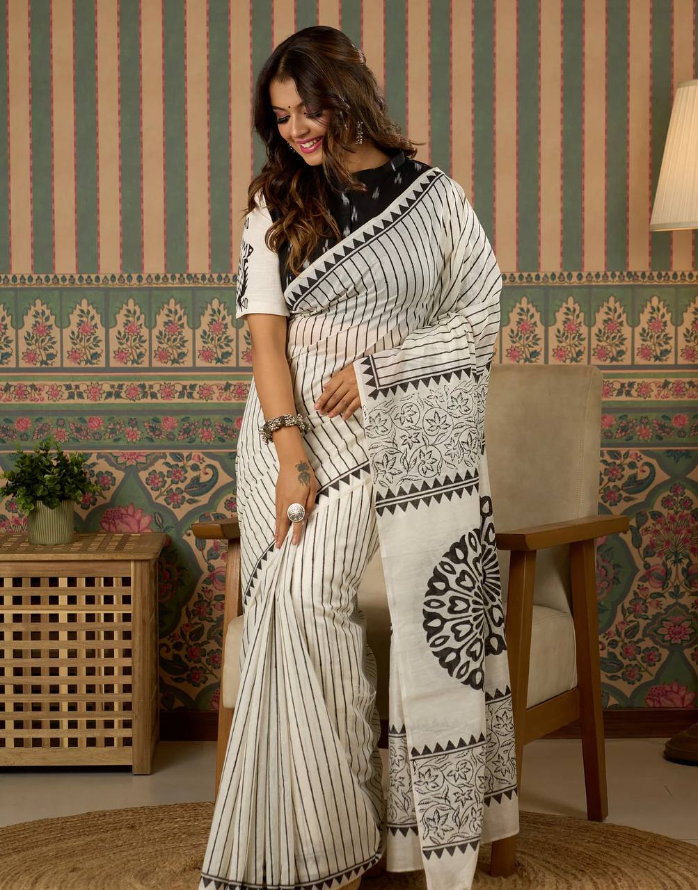 *This saree showcases classy black & white stripes with intricate floral and mandala digital prints on the pallu. Soft, lightweight, and perfect for daily wear, office styling, or a graceful casual look.*