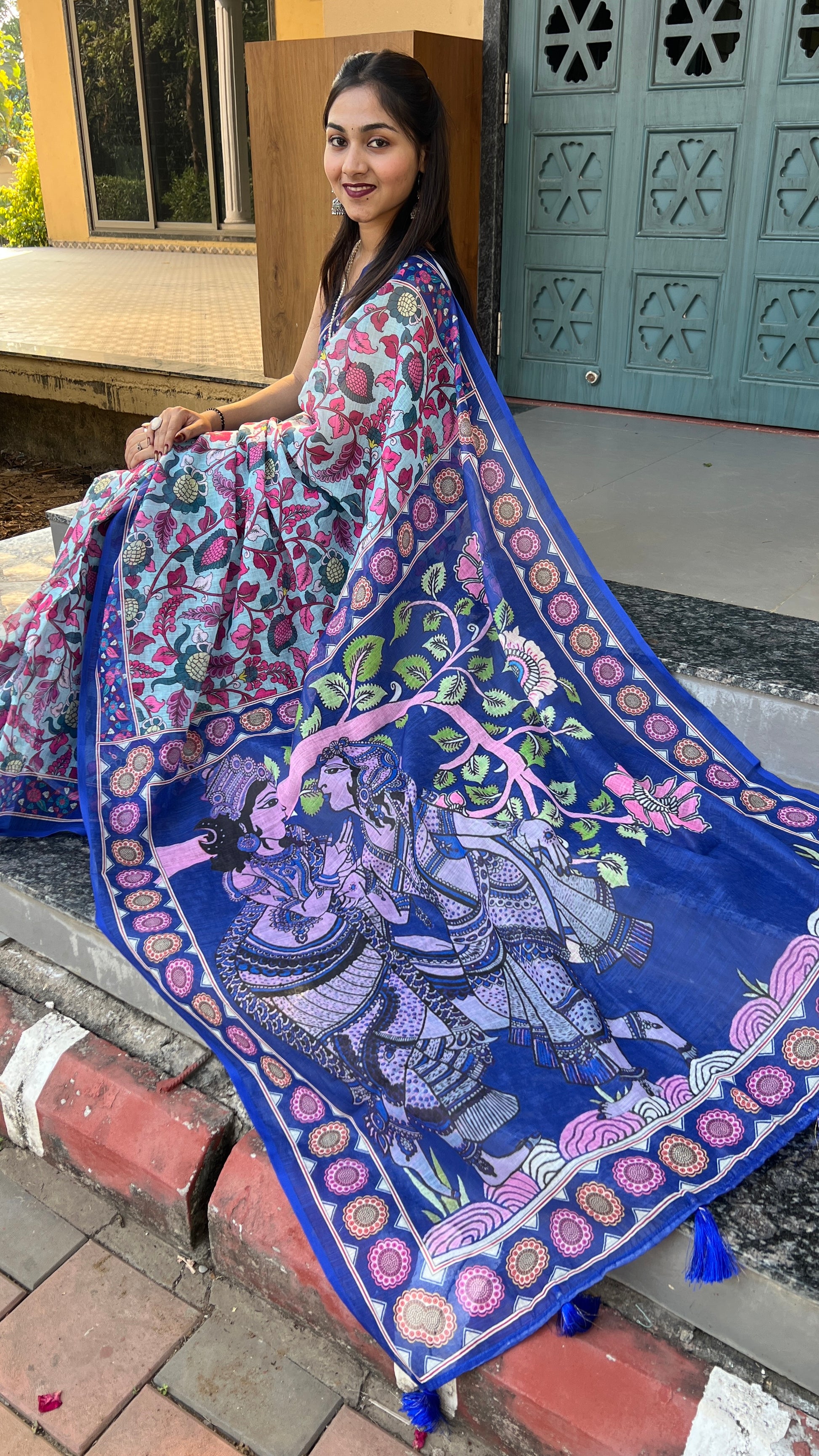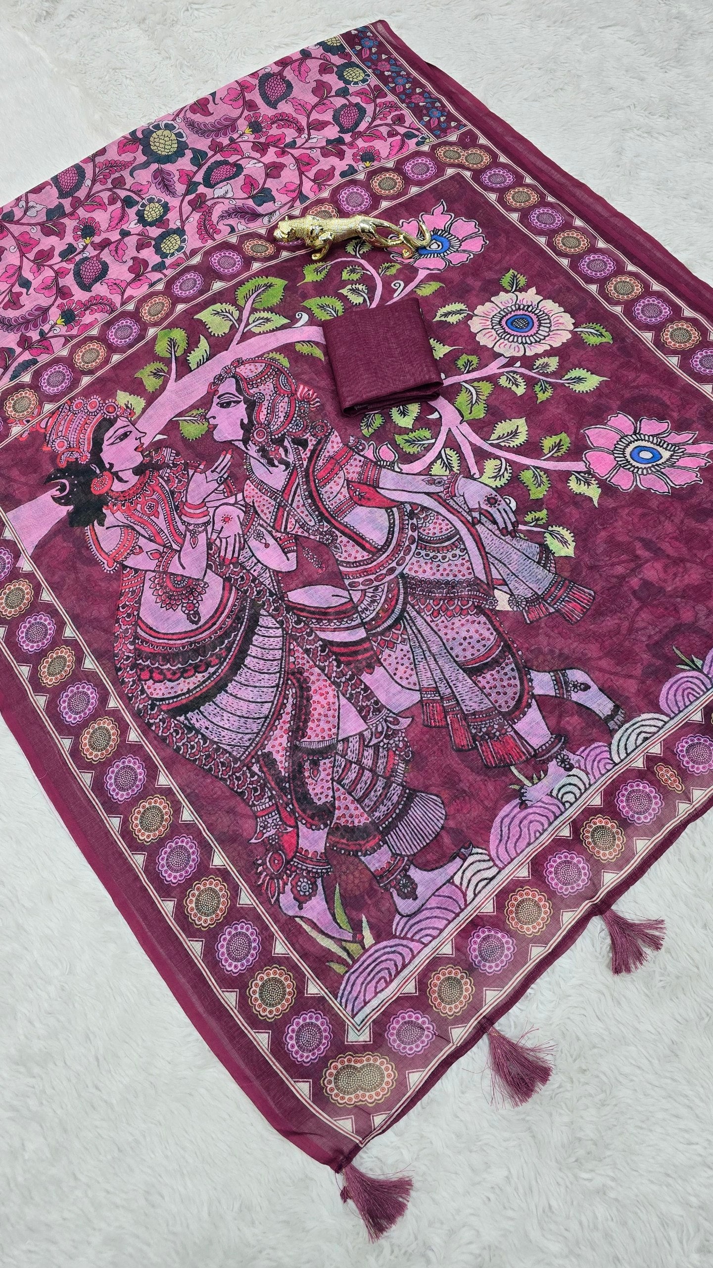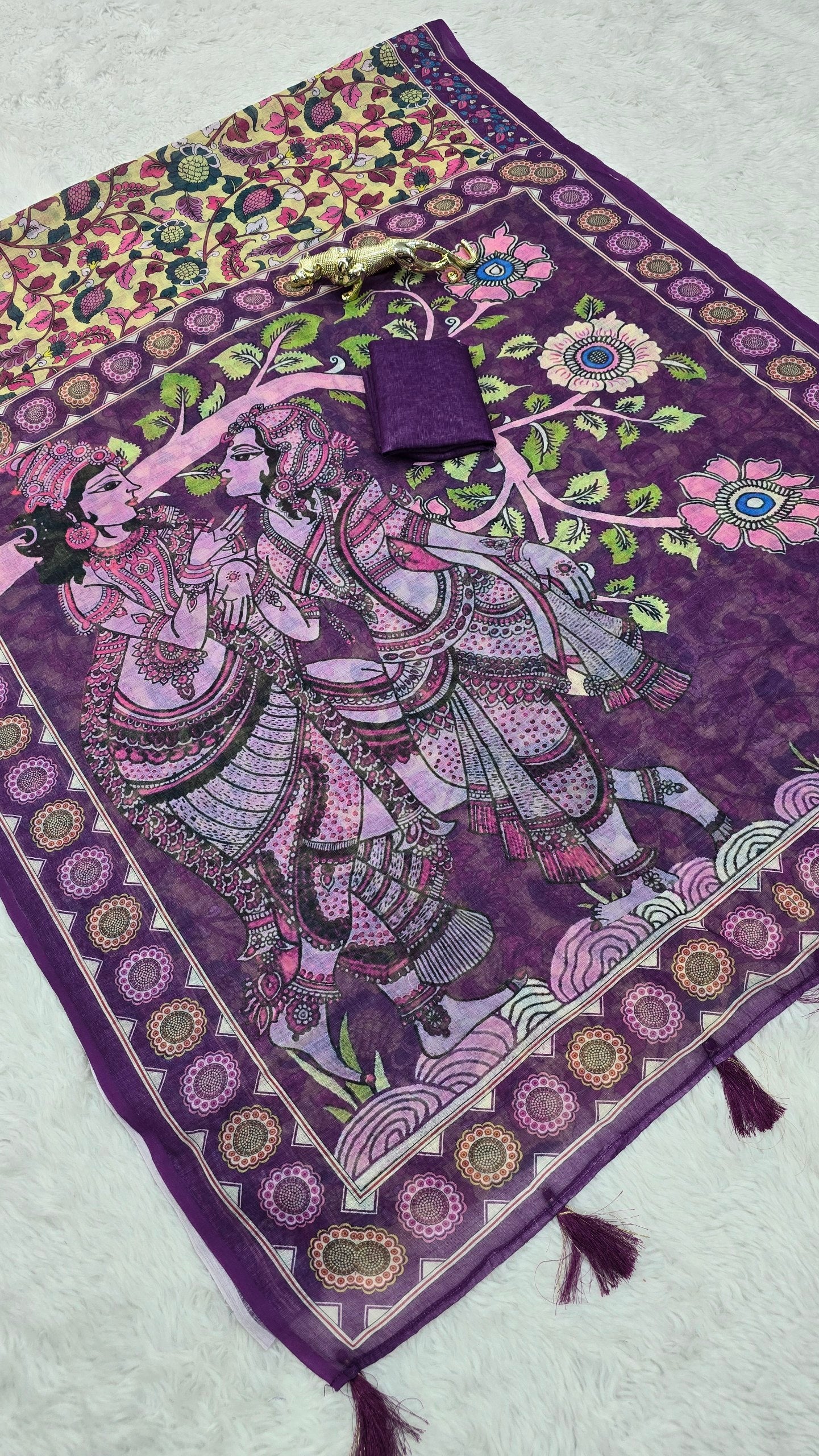 *💠 Pallu:* Beautifully detailed printed pallu featuring artistic traditional artwork with stylish latkan tassels