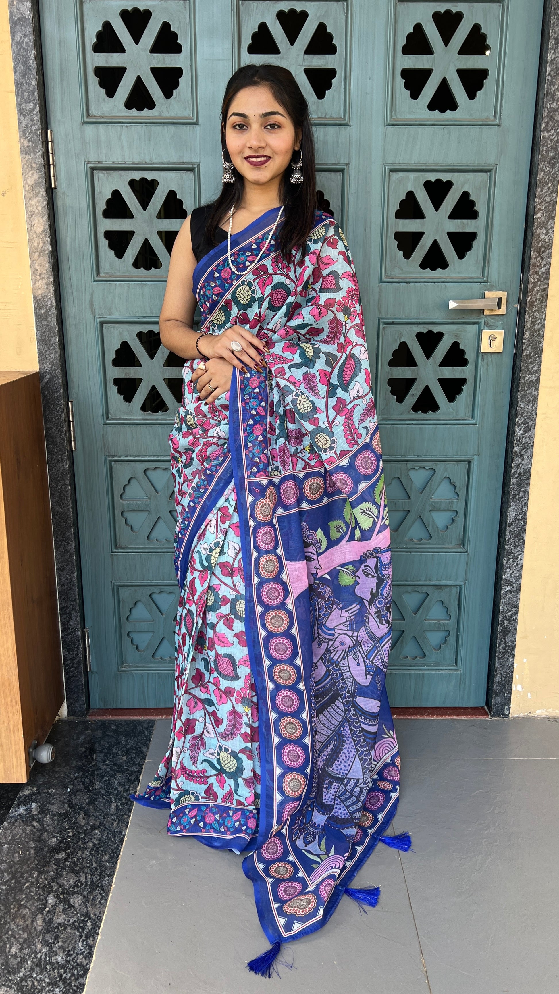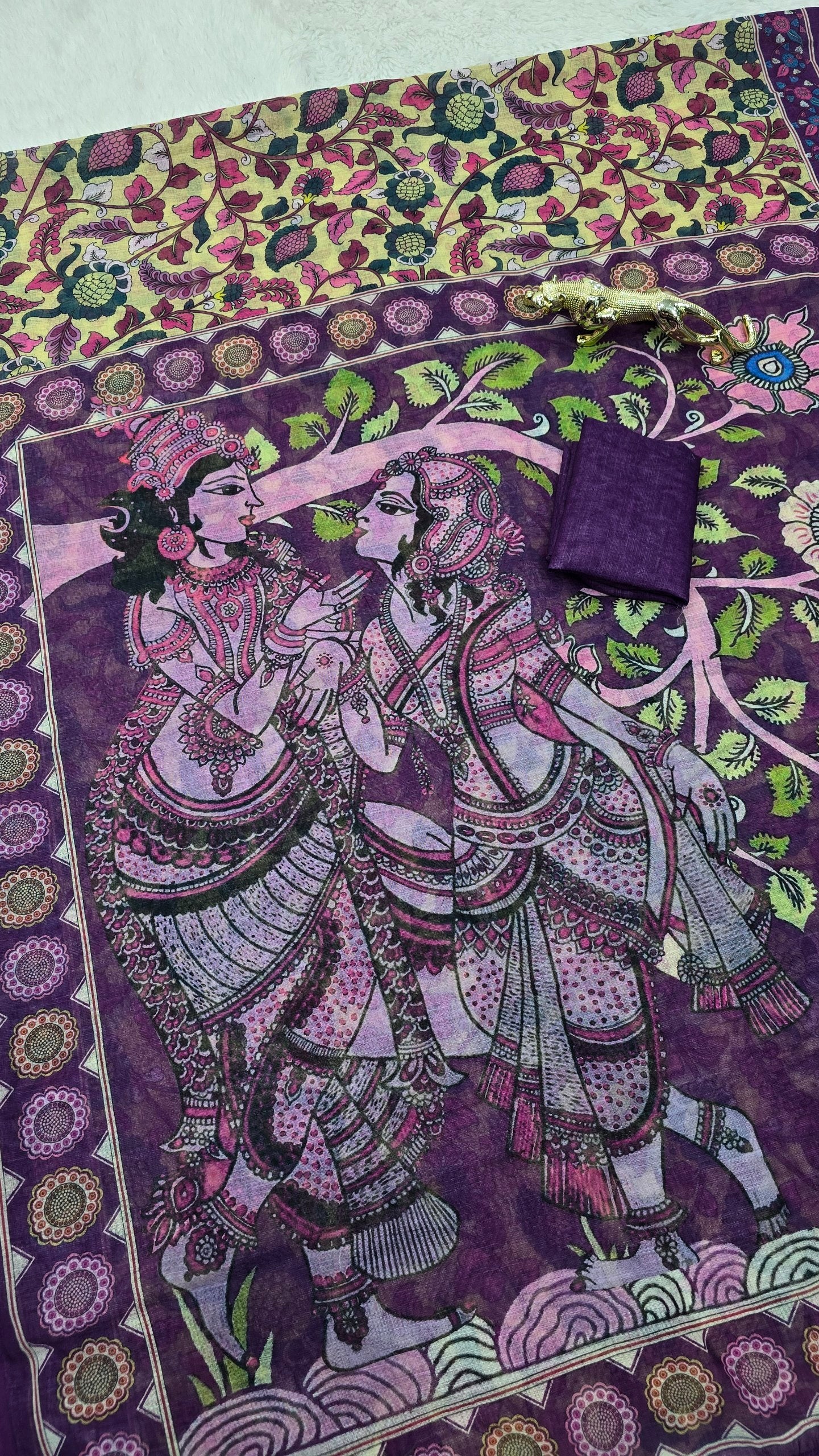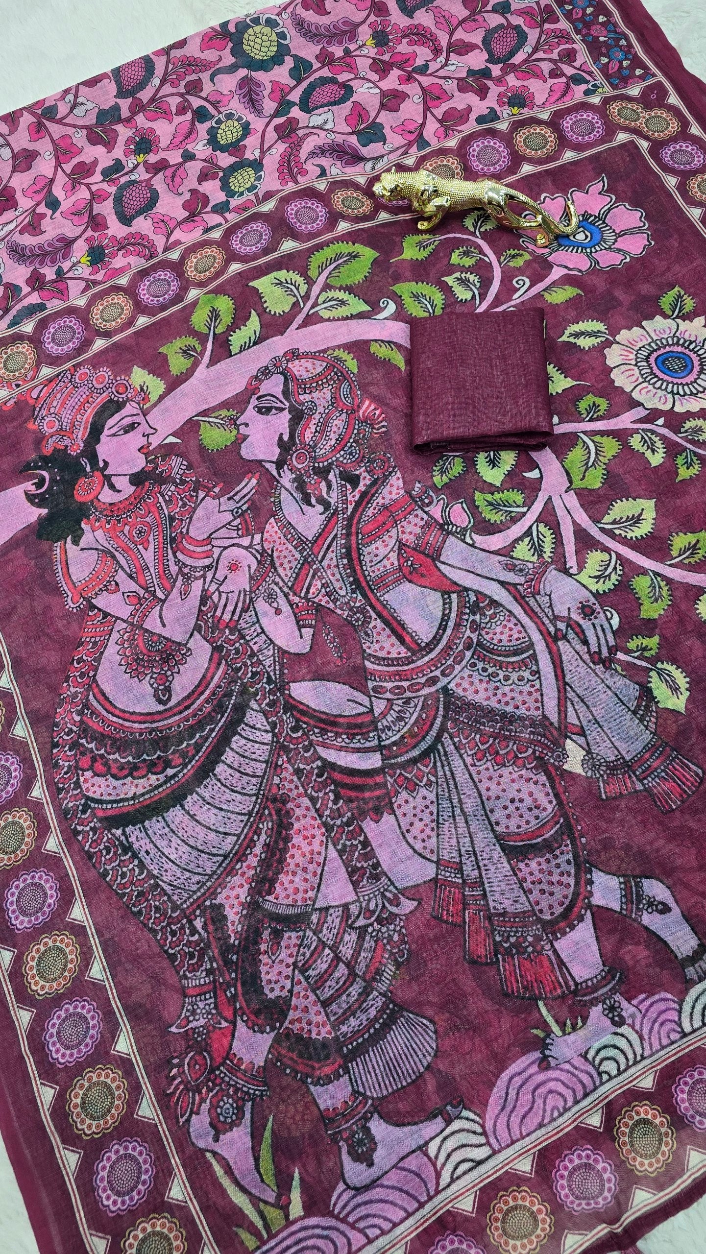 *💠 Pallu:* Beautifully detailed printed pallu featuring artistic traditional artwork with stylish latkan tassels