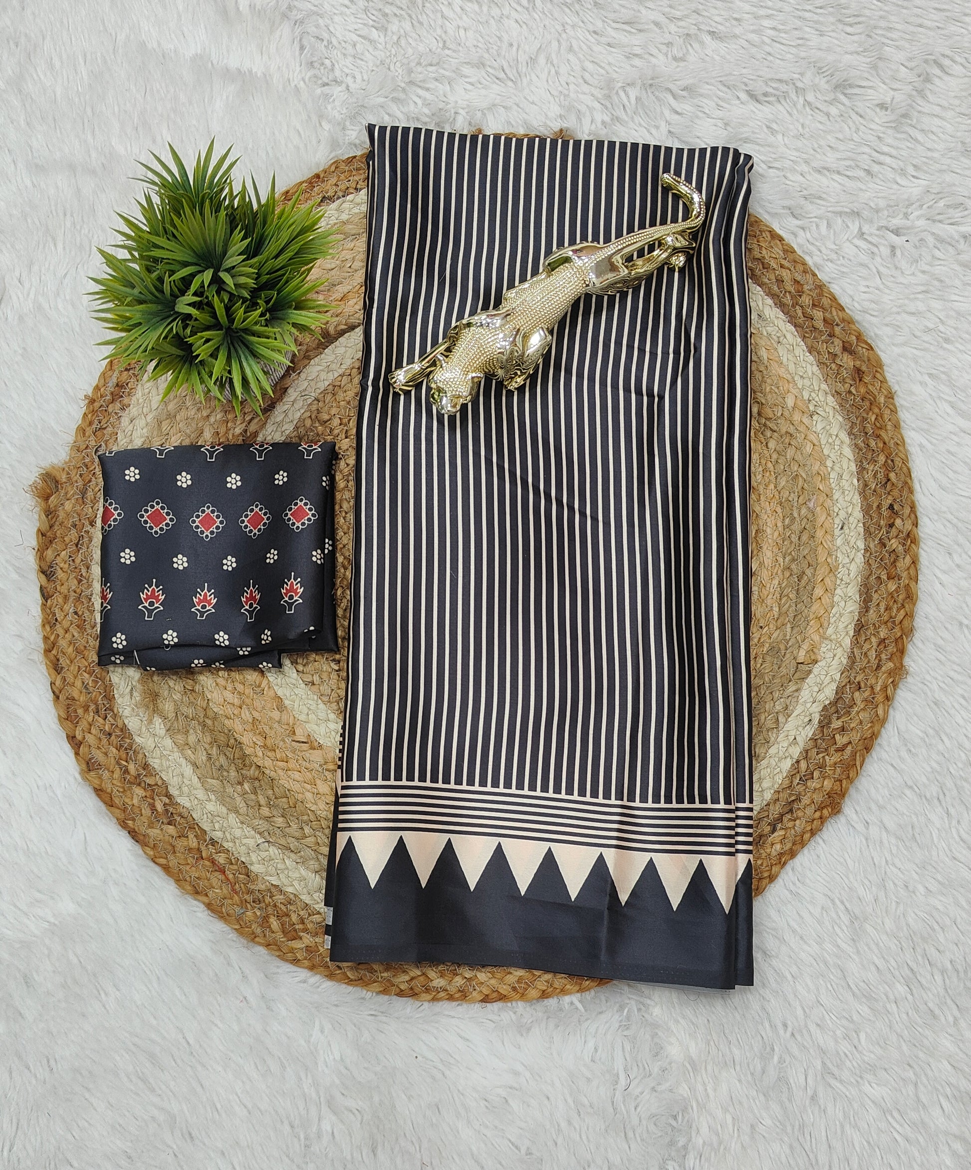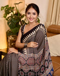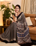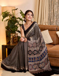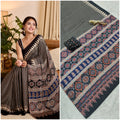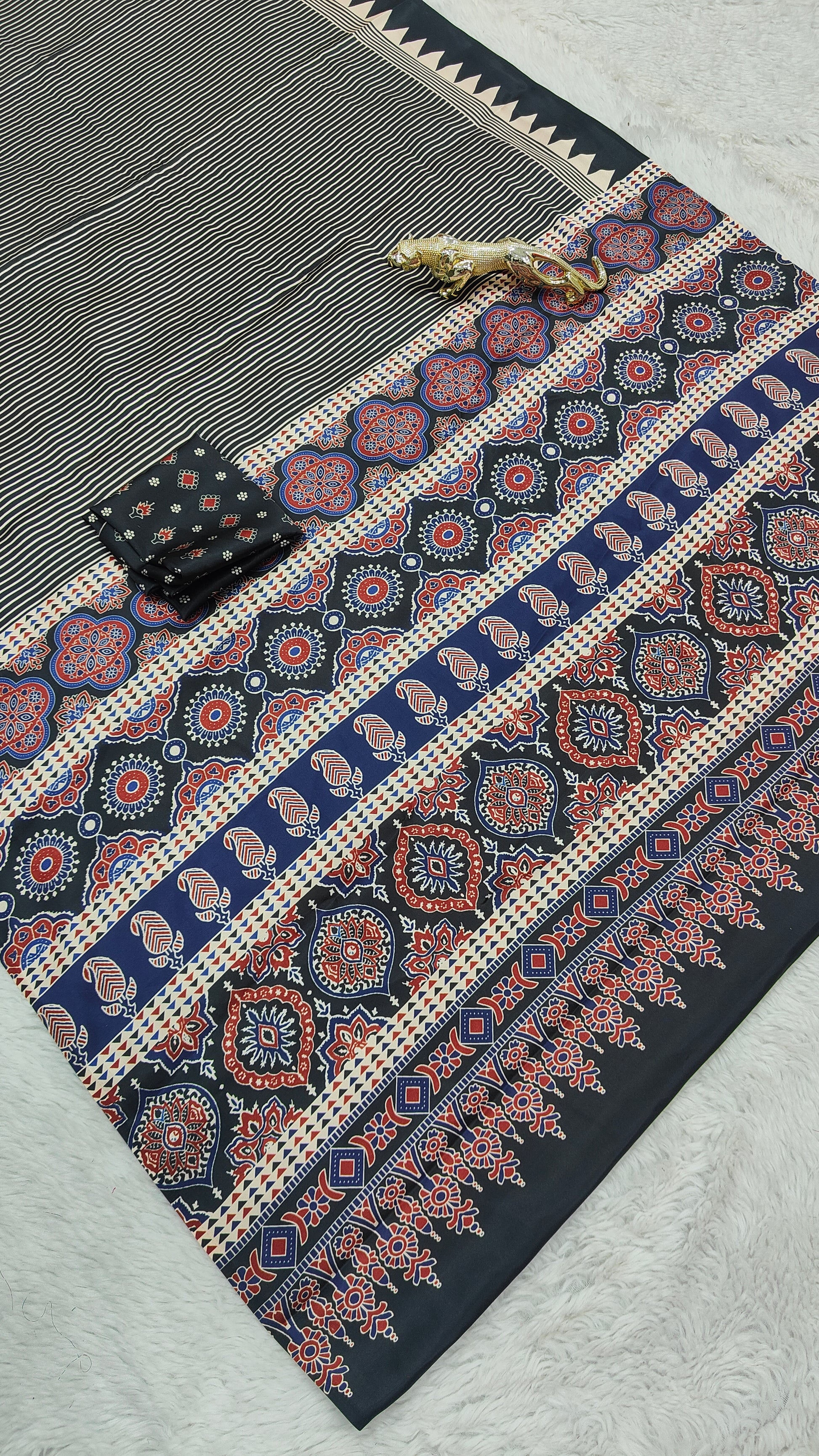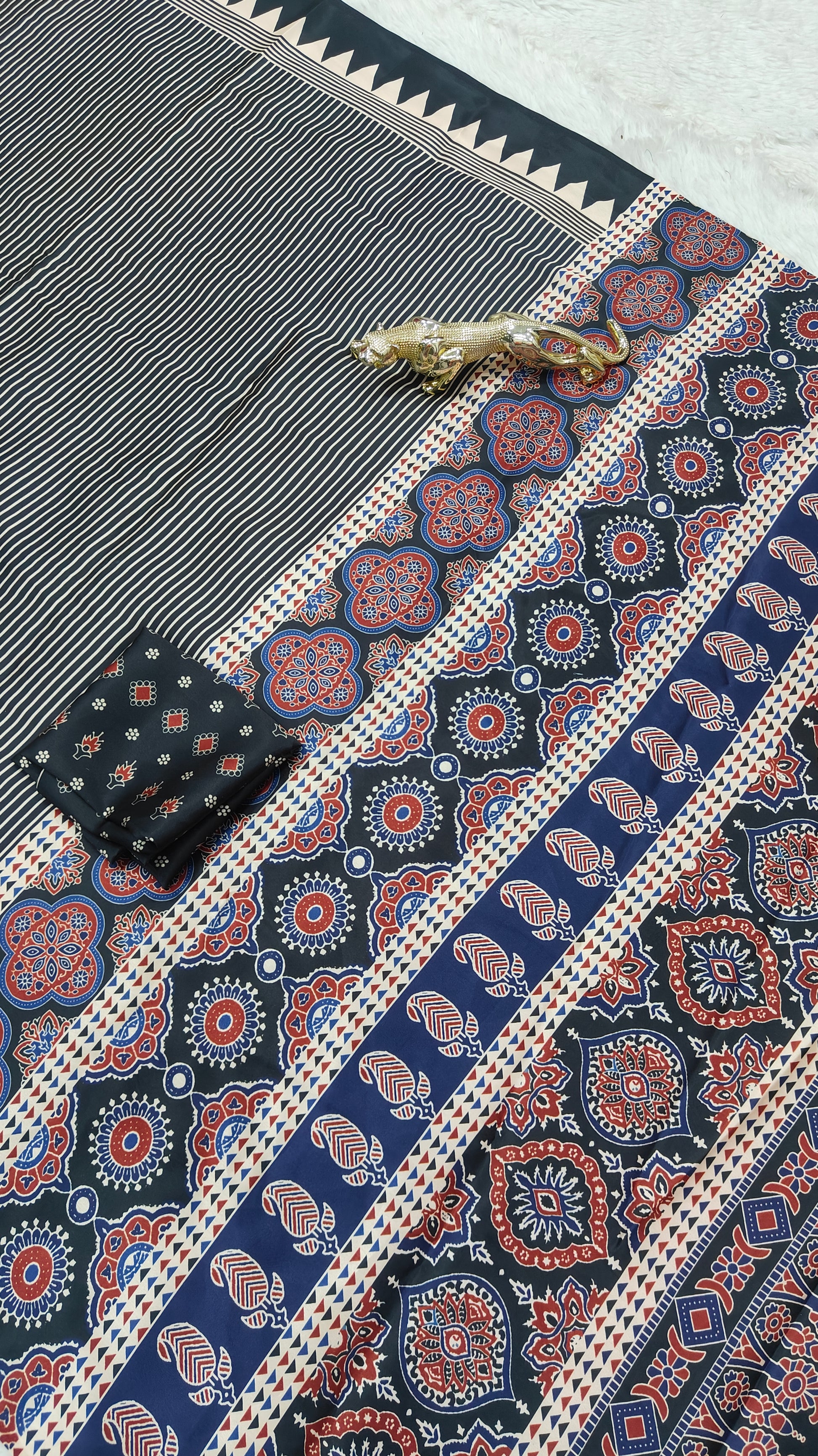 Saree work : Digital Print Border with Ajrakh Rich Pallu With Contrast Blouse